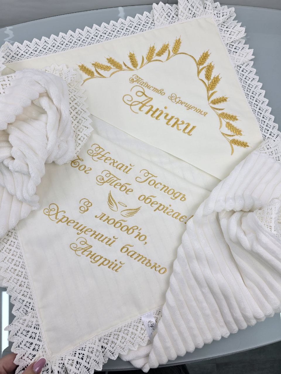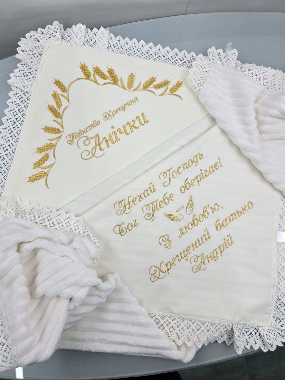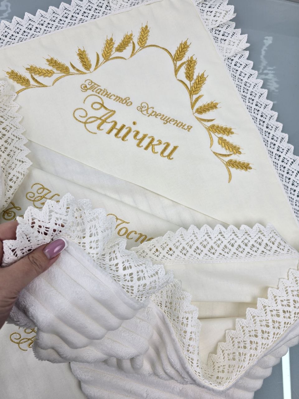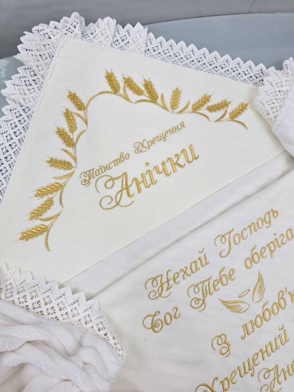 Махрова основа чудово зігріває та вбирає вологу після обряду, а вишивка з ім’ям, побажанням і символікою додає виробу особливого сенсу та індивідуальності