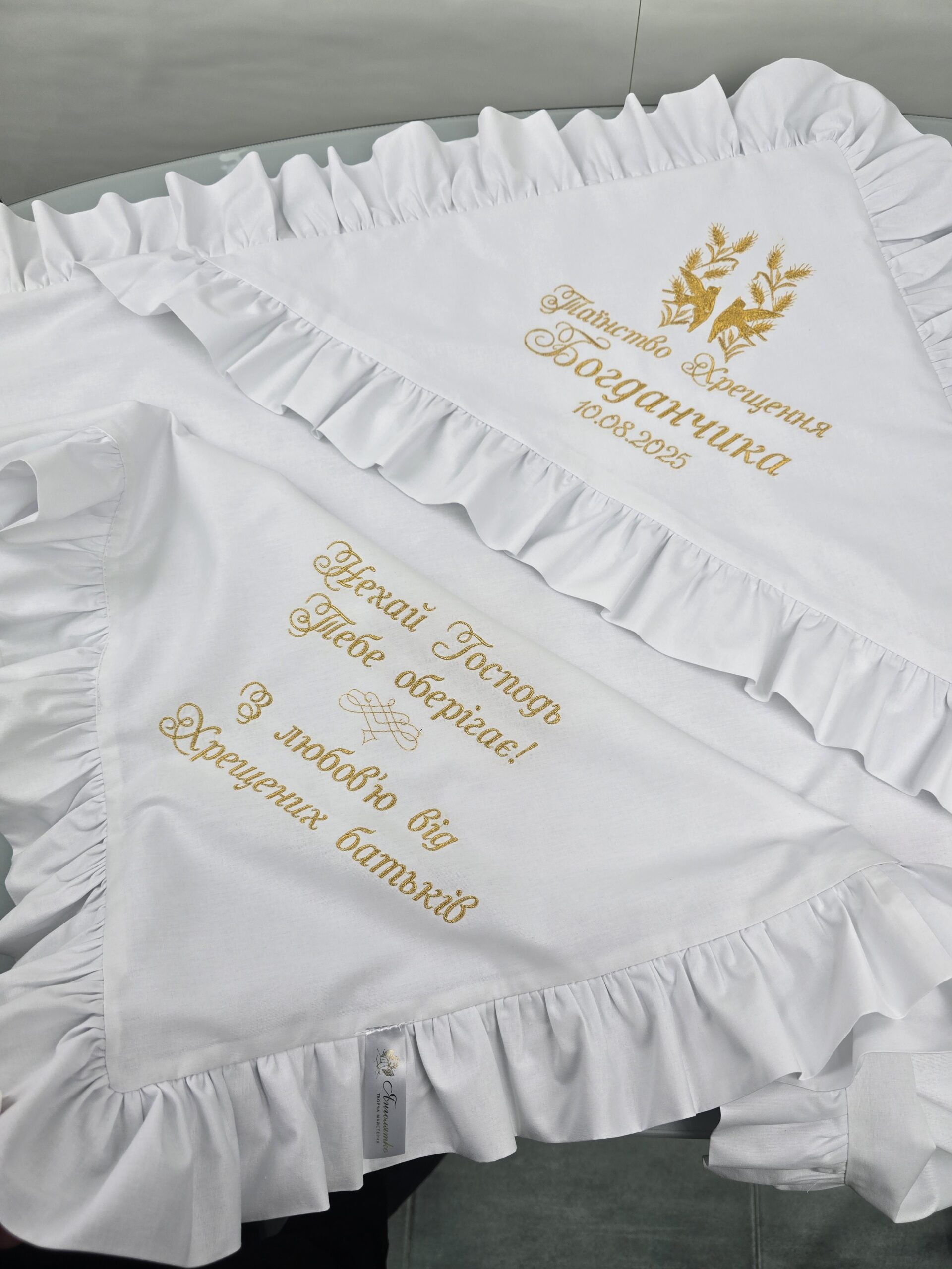 Крижма з ранфорсу та велюру з рюшами
