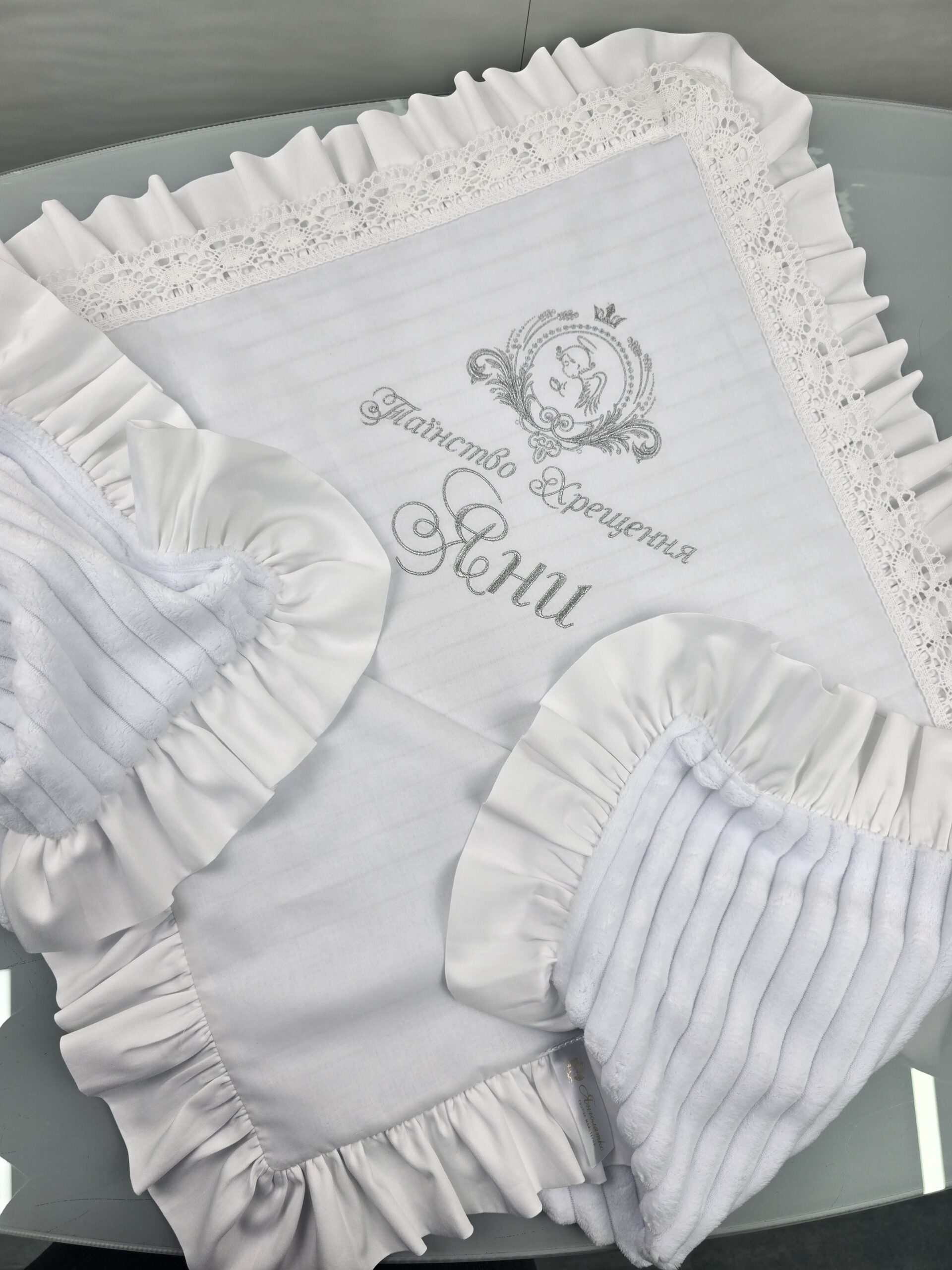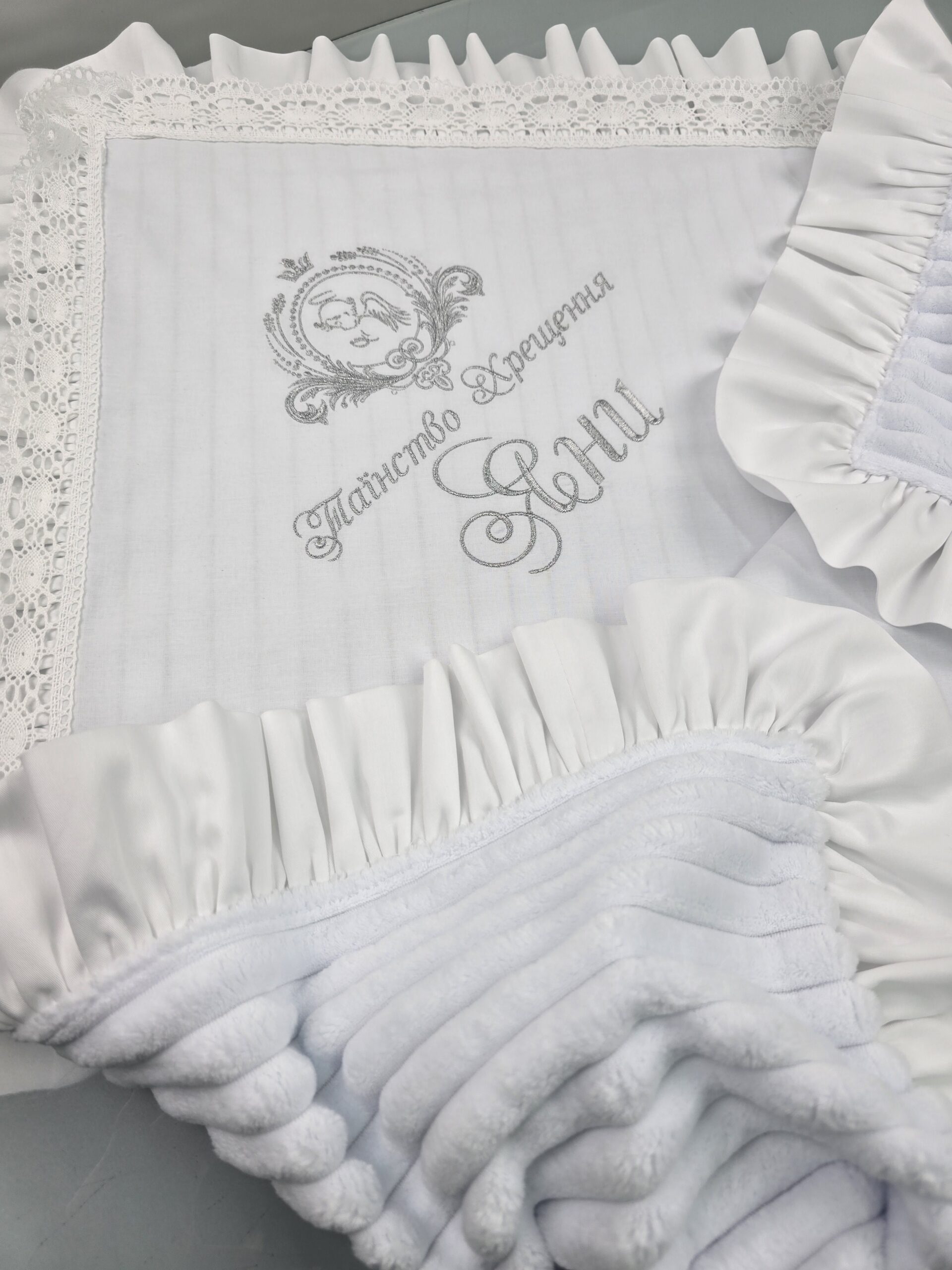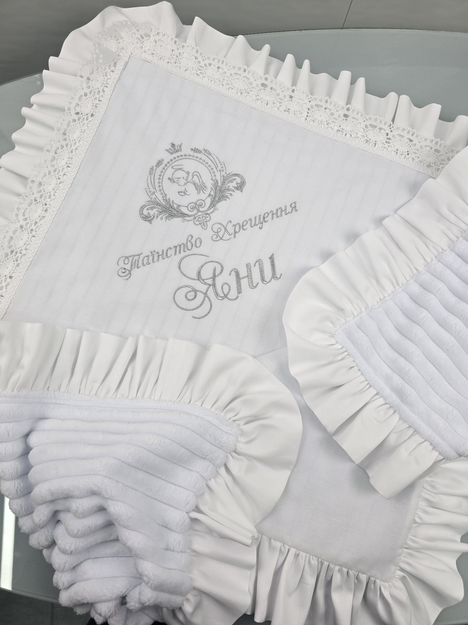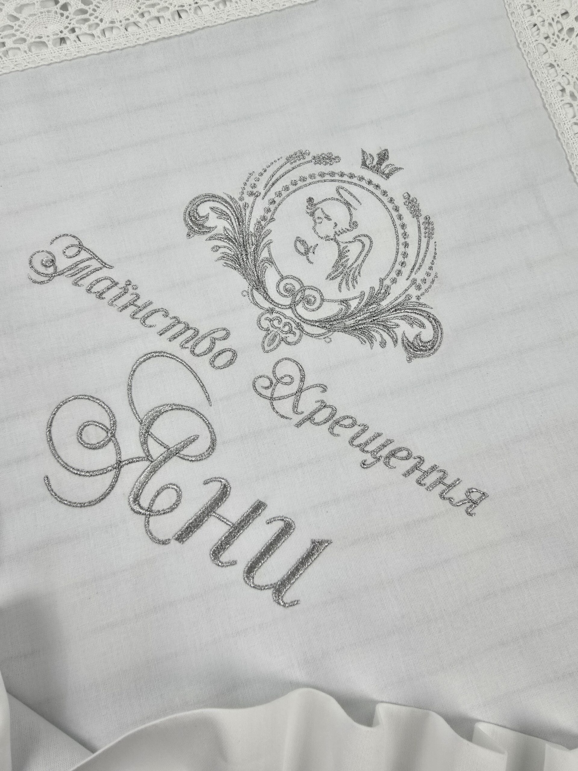 Світла тканина зі стриманою фактурою та срібною іменною вишивкою підкреслює ніжність і чистоту обряду хрещення