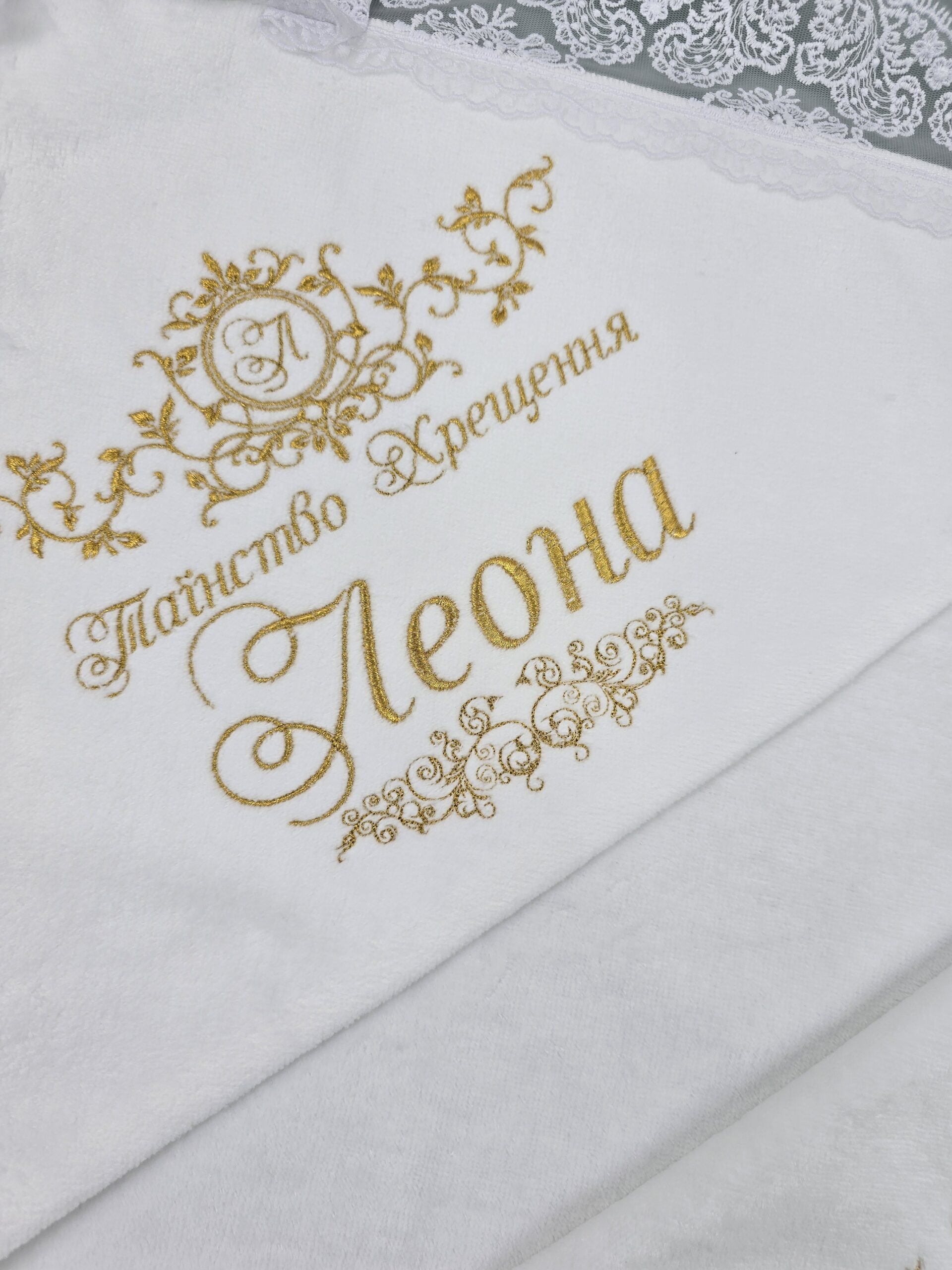 М’яка велюрова основа дарує тепло та комфорт малюку після купелі, а витончена іменна вишивка робить виріб особливим і пам’ятним