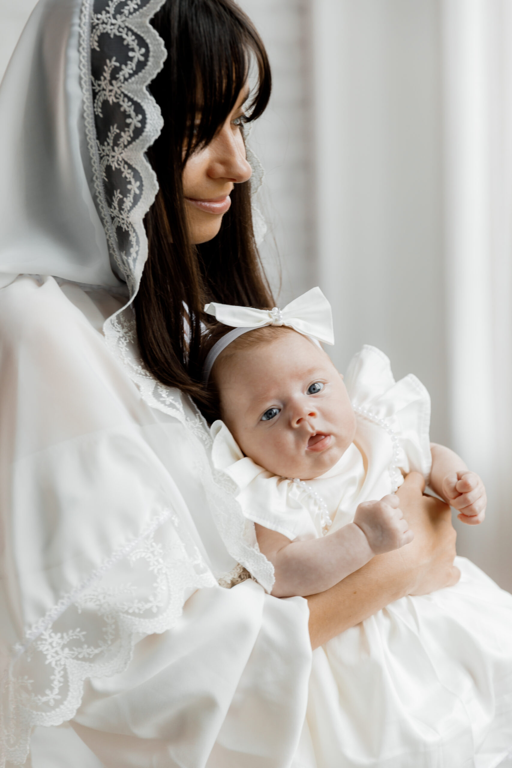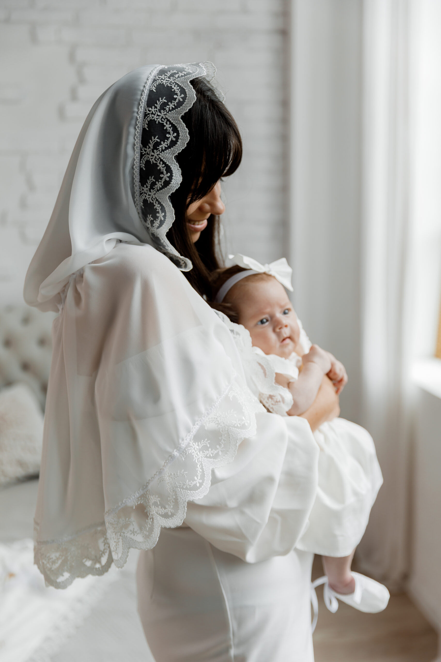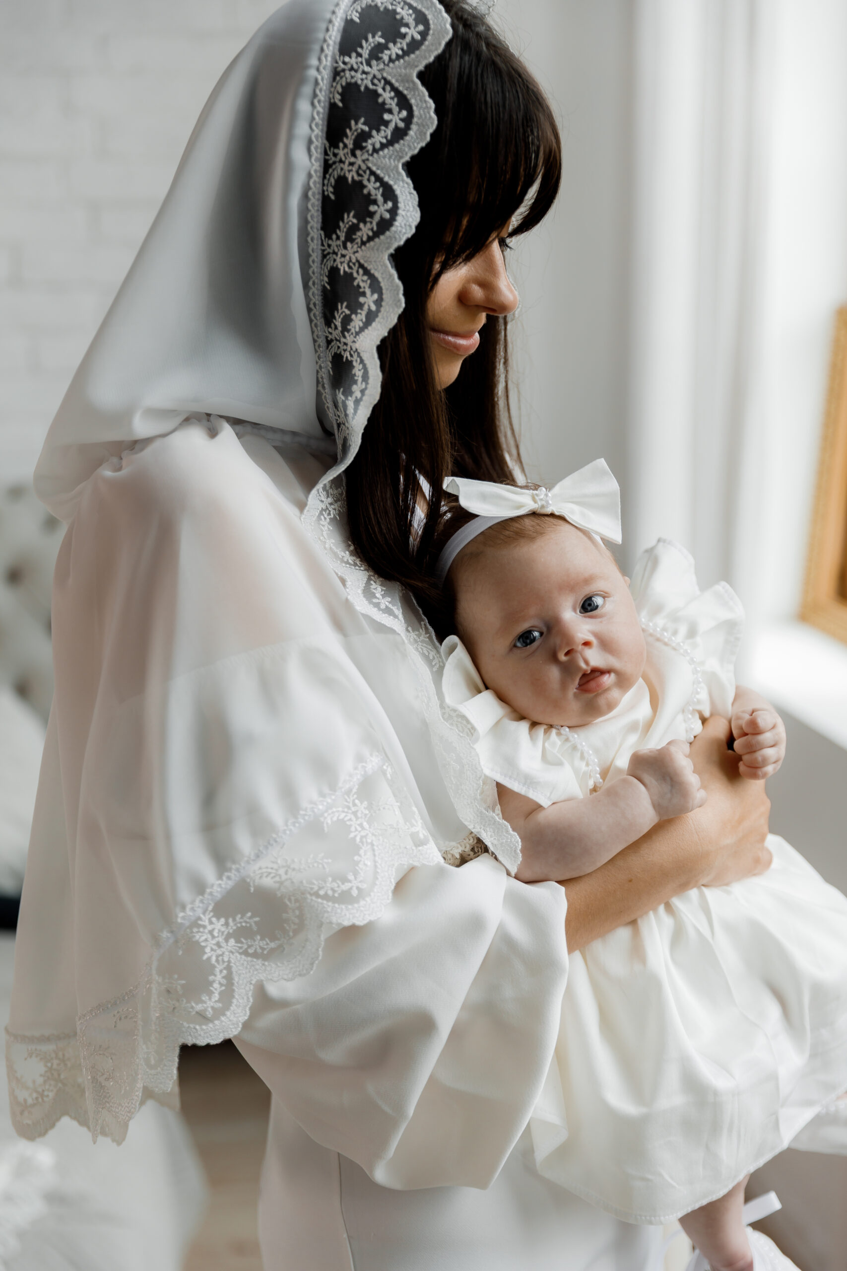 Палантин з молочним ажурним мереживом — це витончений аксесуар для хрещення, який створює ніжний, світлий та по-справжньому святковий образ хрещеної мами
